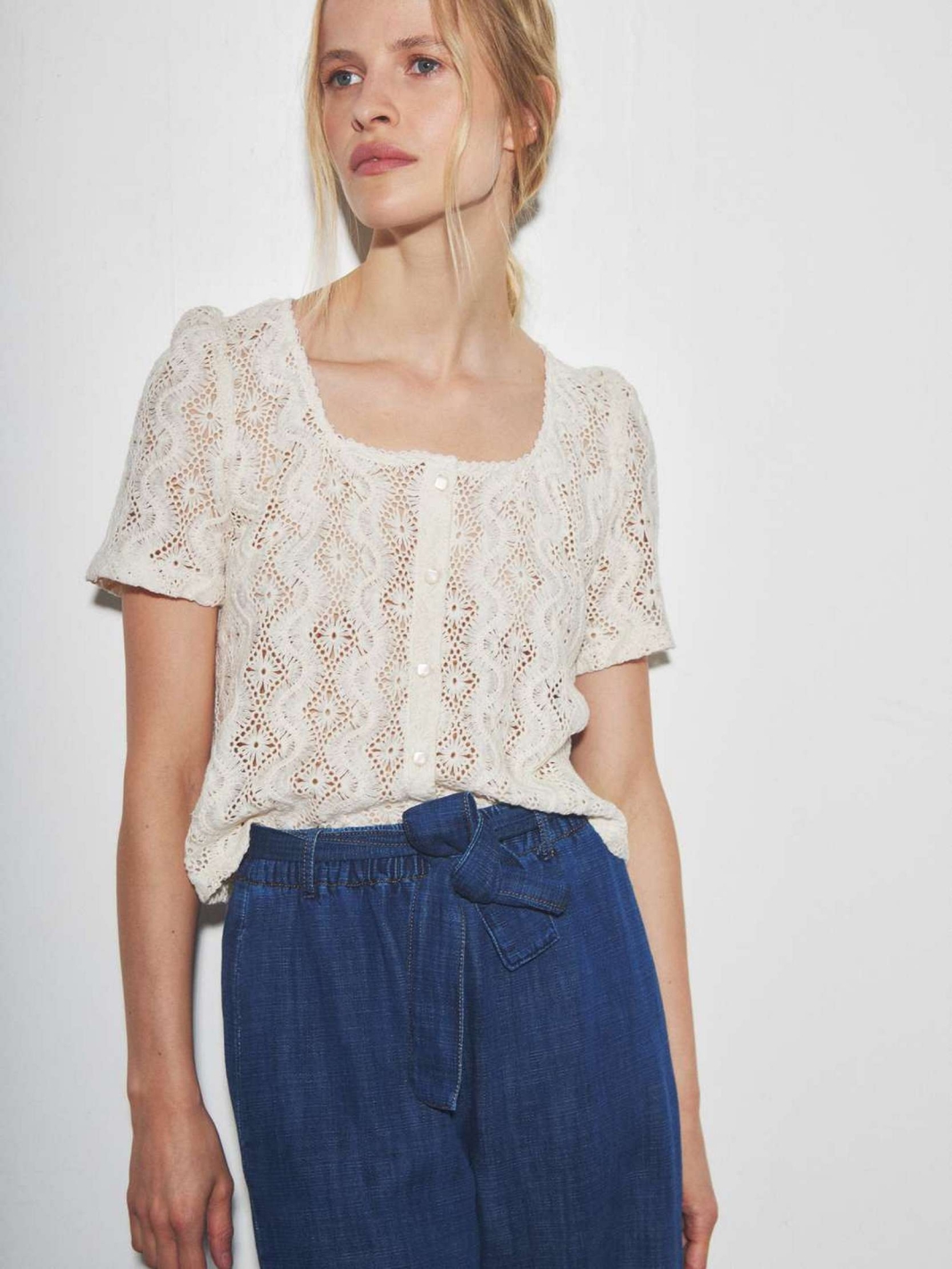 ATOME est une blouse à manches courtes confectionnée dans une dentelle ajourée de couleur écrue.
