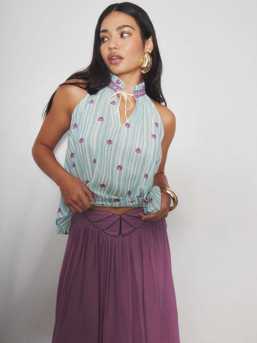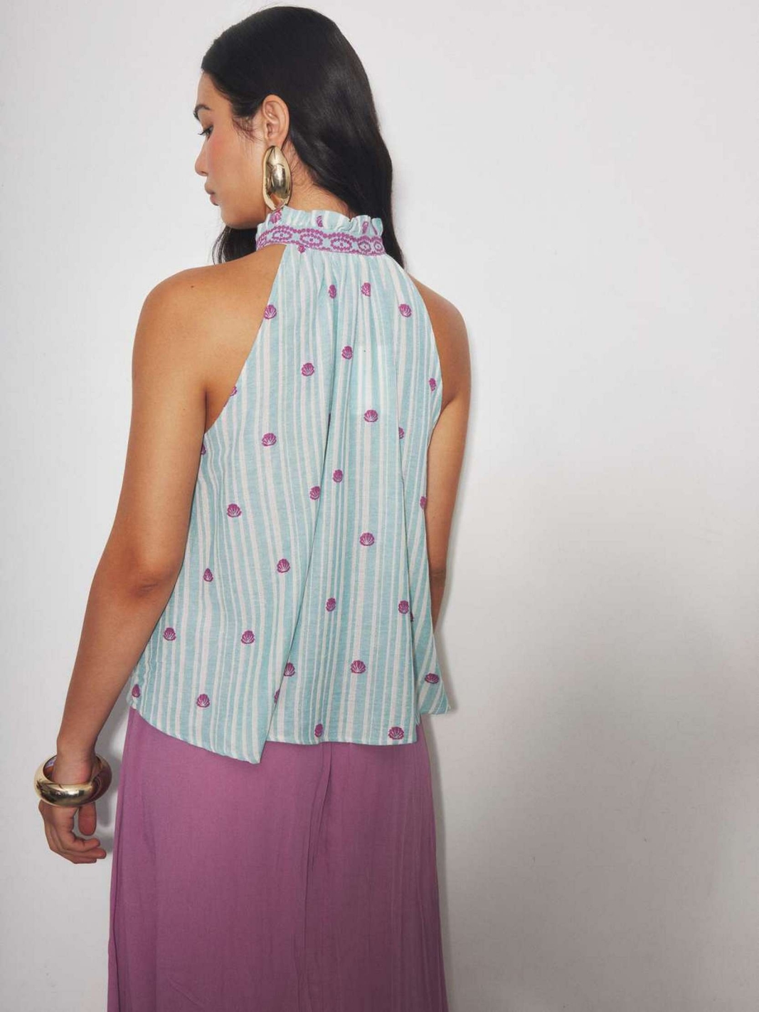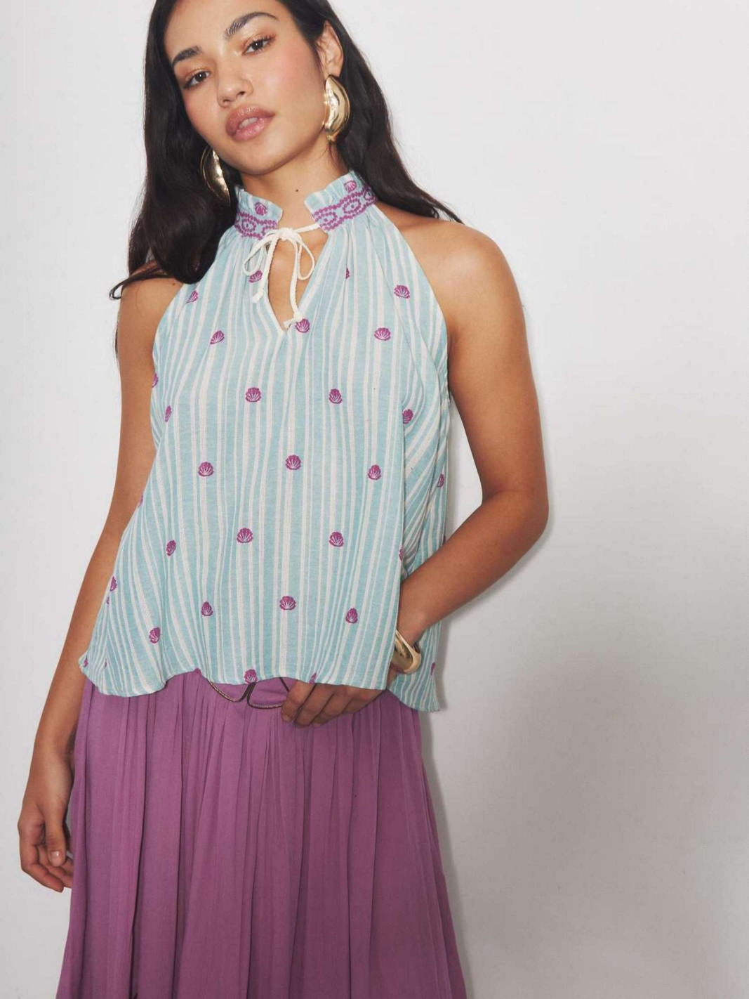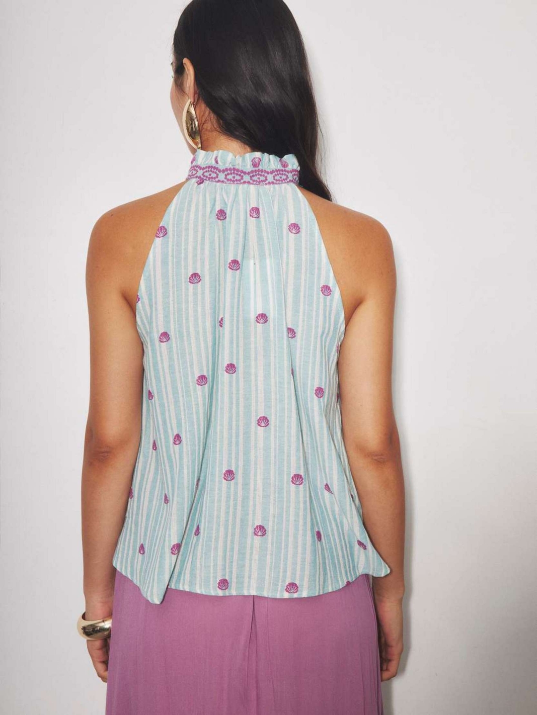 AXELLE est un top sans manches à rayures avec un col montant et une petite ouVerture nouée à l'encolure.