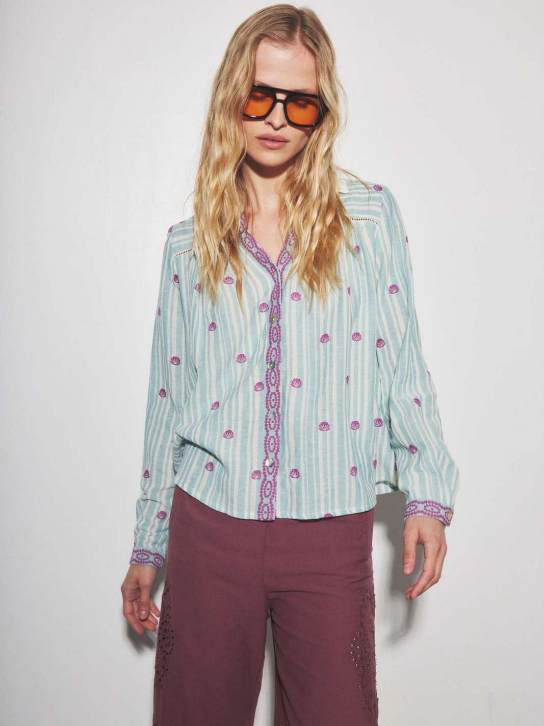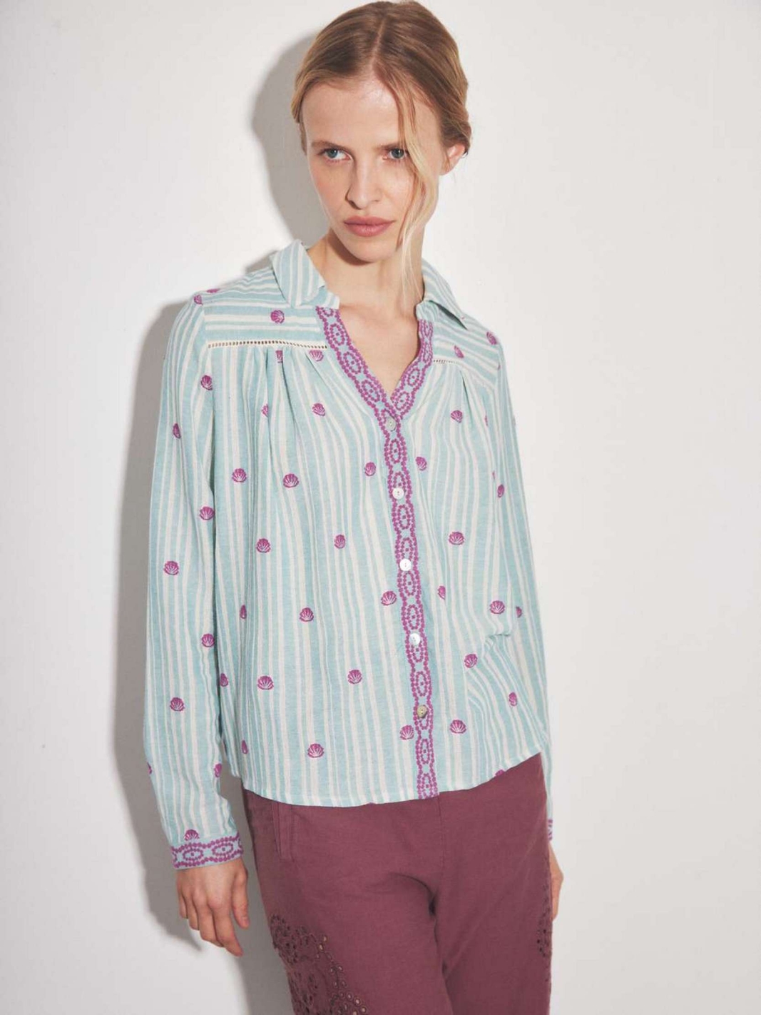 Elle se distingue par ses broderies contrastées de couleur violette, mêlant motifs géométriques le long de la patte de boutonnage et petits coquillages disséminés.