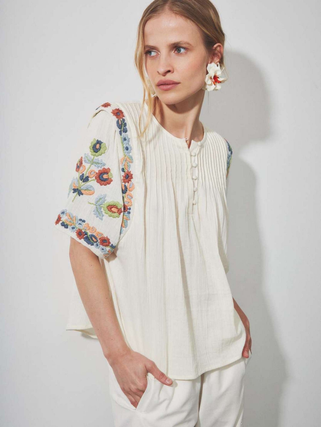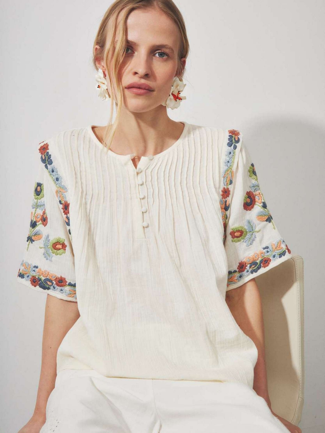 Sa coupe droite et son tombé fluide sont mis en valeur par des broderies florales colorées sur les épaules et les manches. Sa matière légère en fait une pièce confortable et élégante, parfaite pour la saison estivale.