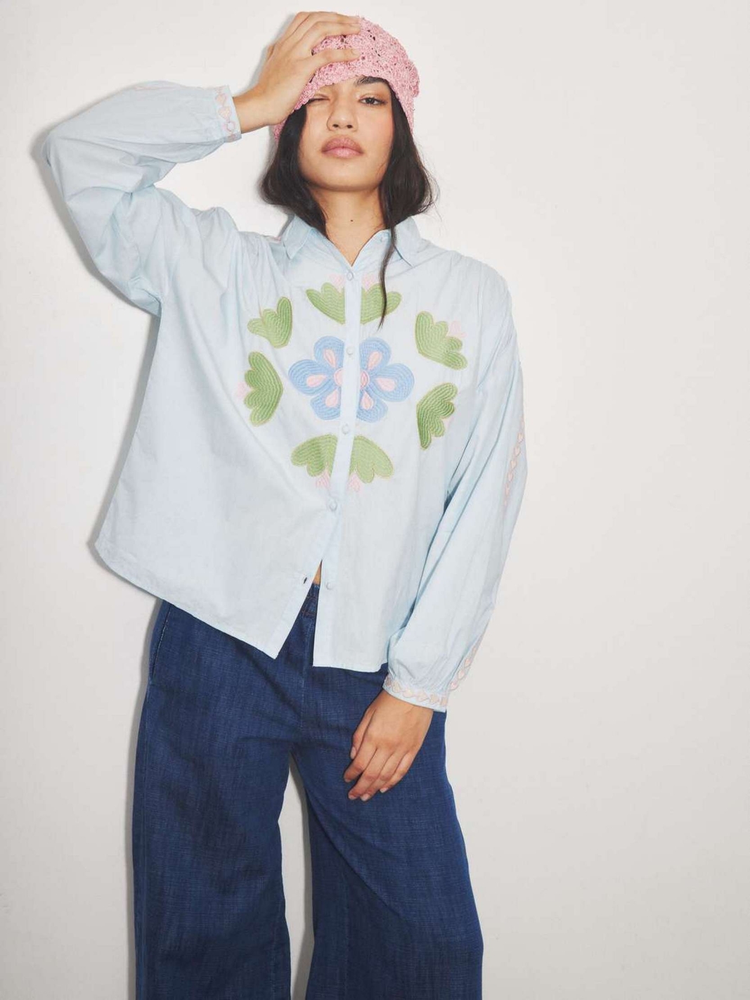 FANDORA est une chemise à manches longues boutonnée avec un col classique et une broderie florale imposante sur le devant.