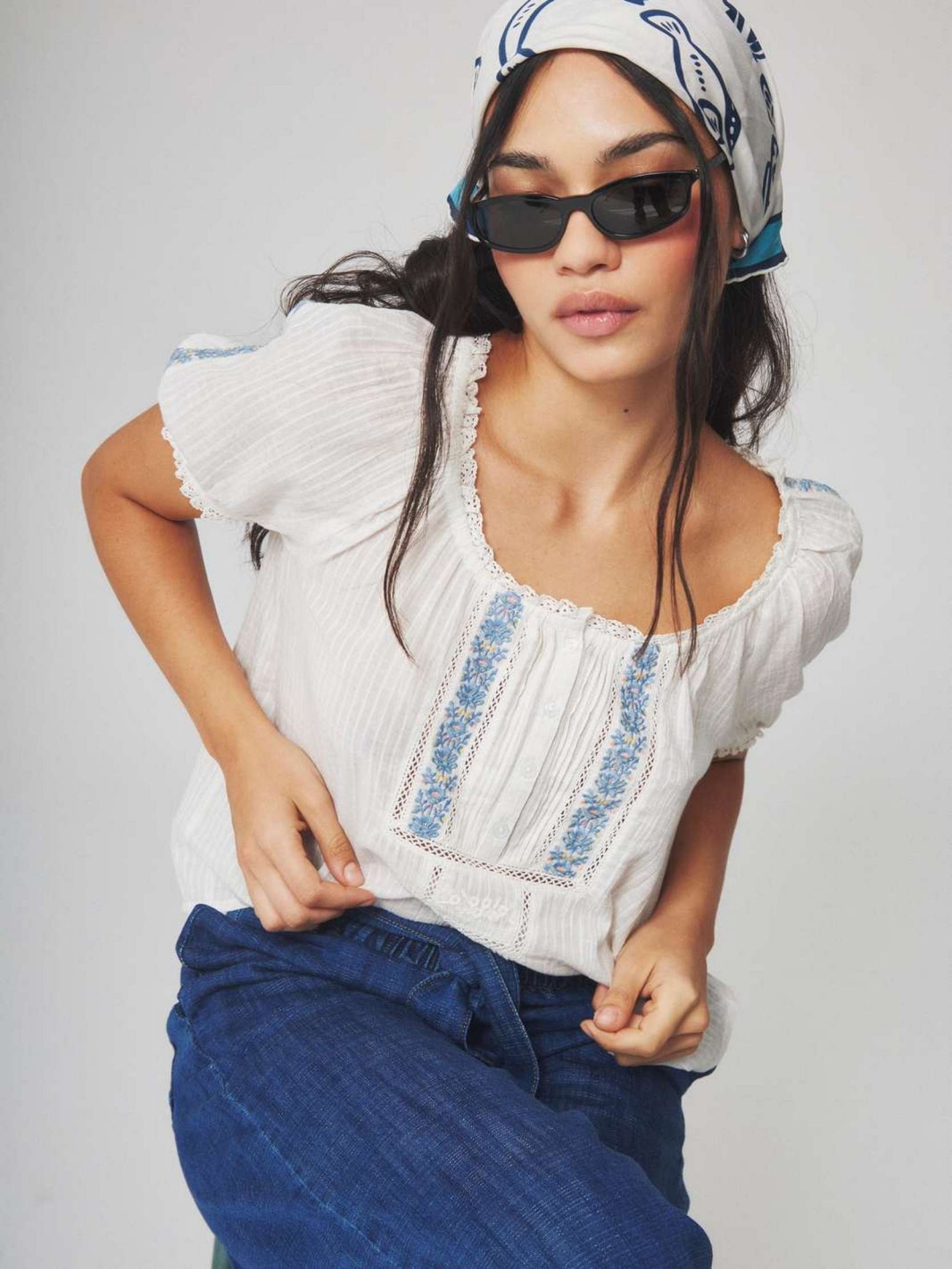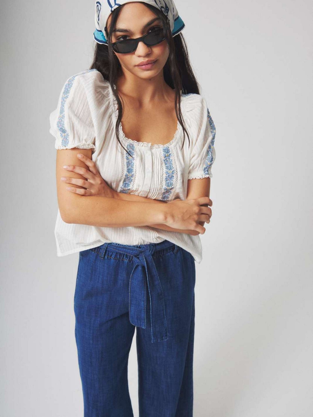 FRAM est une blouse à manches courtes bouffantes avec un col arrondi boutonné et des broderies contrastées Navyes qui soulignent le buste.