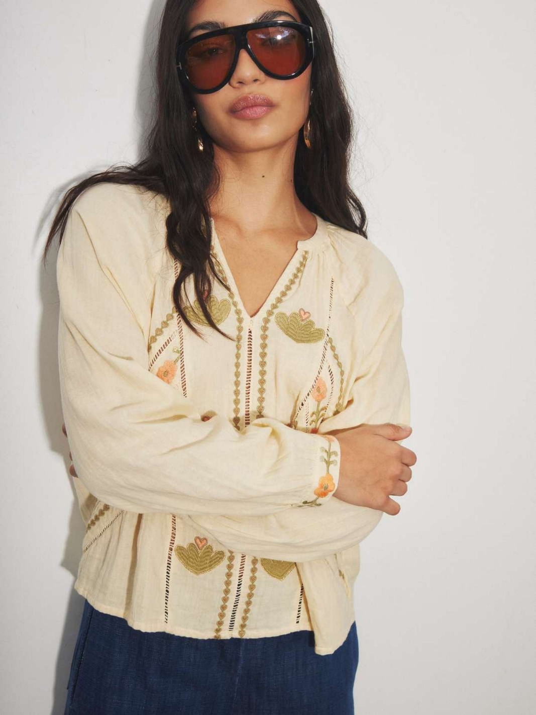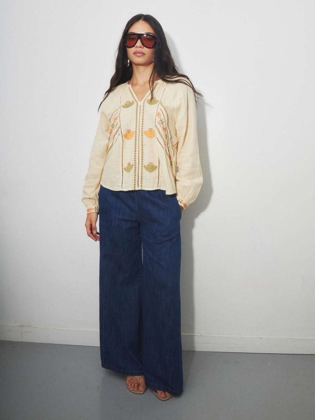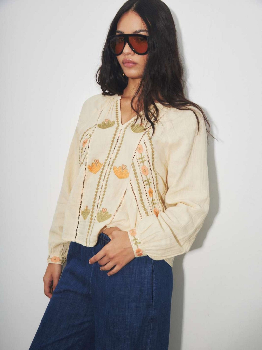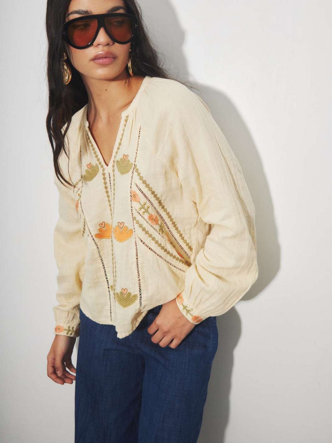 NIKKI est une blouse à manches longues avec un col en V et des broderies florales colorées sur le devant et les poignets. Sa coupe droite, agrémentée de détails ajourés et d'une matière légère, en fait une pièce confortable et intemporelle.