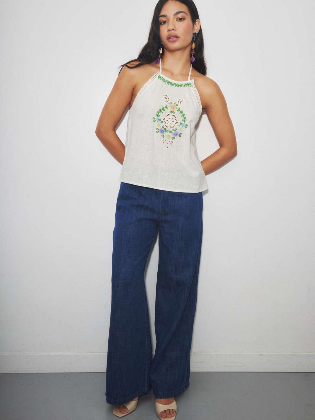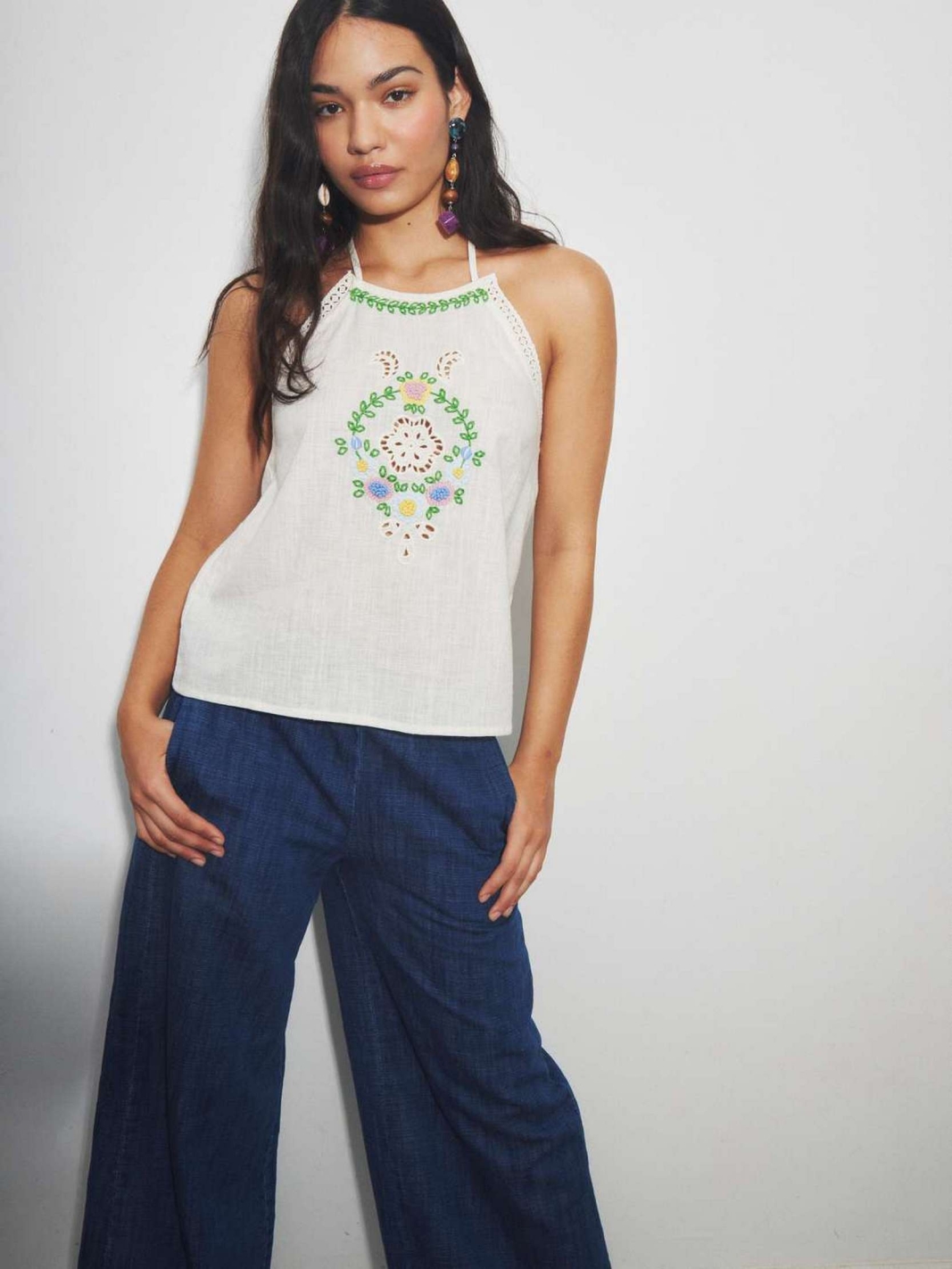 RAIDON se distingue par son encolure américaine délicate et son plastron central orné de broderies florales multicolores et de détails ajourés. Ce top sans manches propose une coupe fluide et légère qui sublime la silhouette avec élégance. Son coloris blanc pur et la finesse de ses finitions en font un essentiel de garde-robe à la fois frais et sophistiqué.