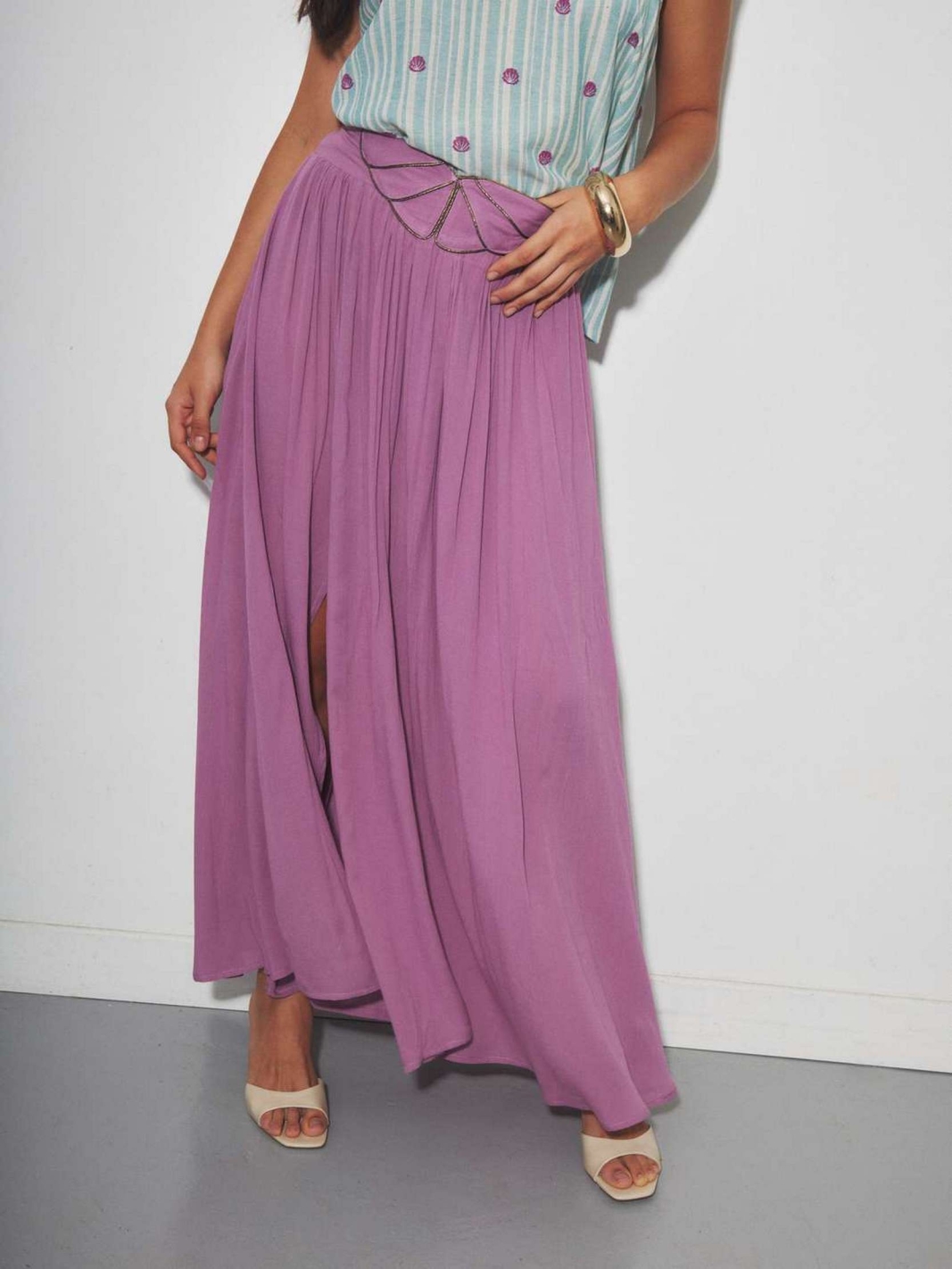 KALIN est une jupe longue à la coupe évasée offrant un tombé fluide et léger, agrémentée d'une fente sur le devant.
