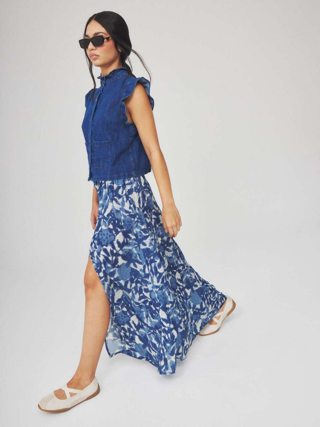 KOLA est une jupe longue à l'imprimé floral Navy avec une coupe évasée et une fente sur le devant.