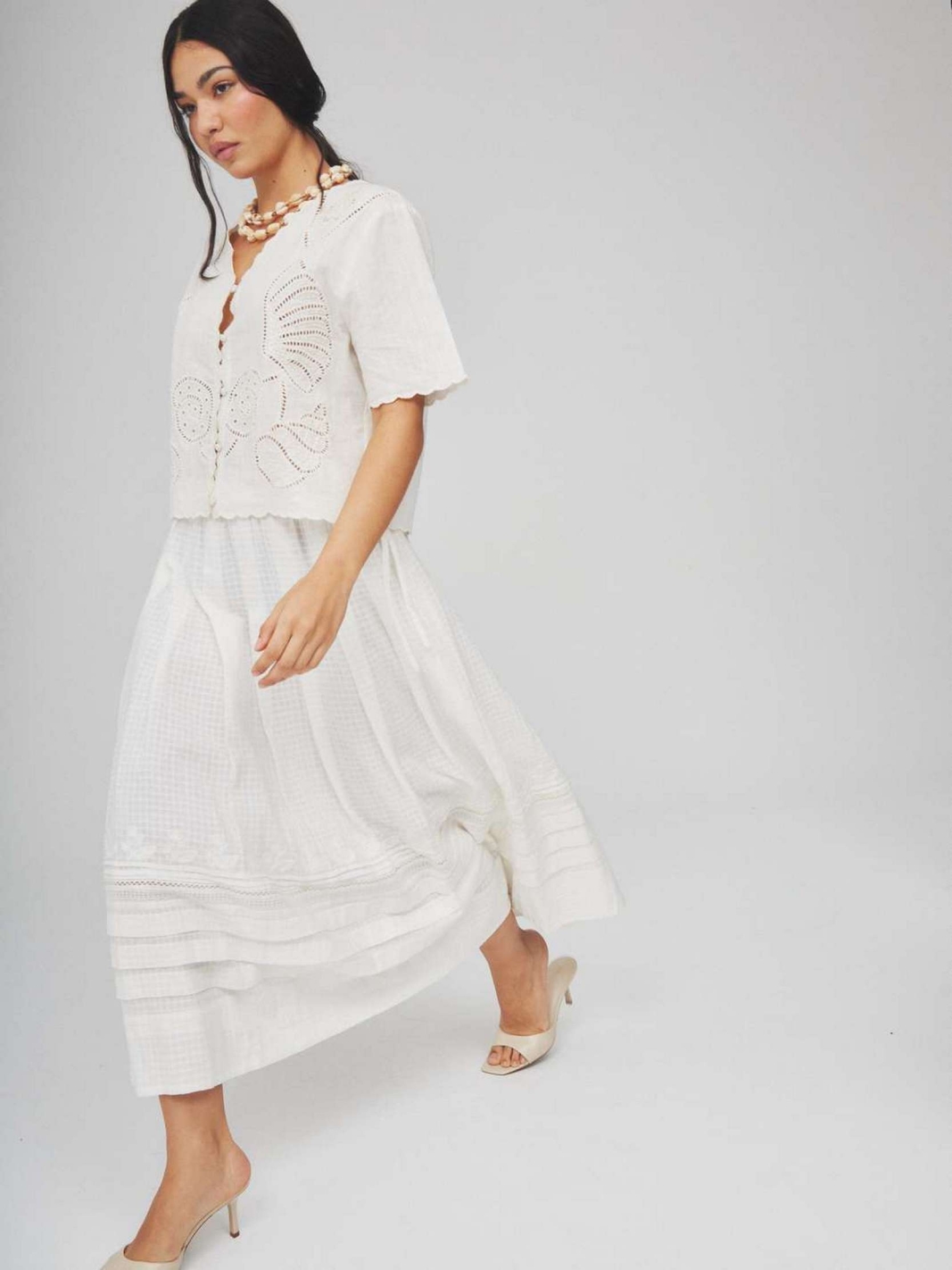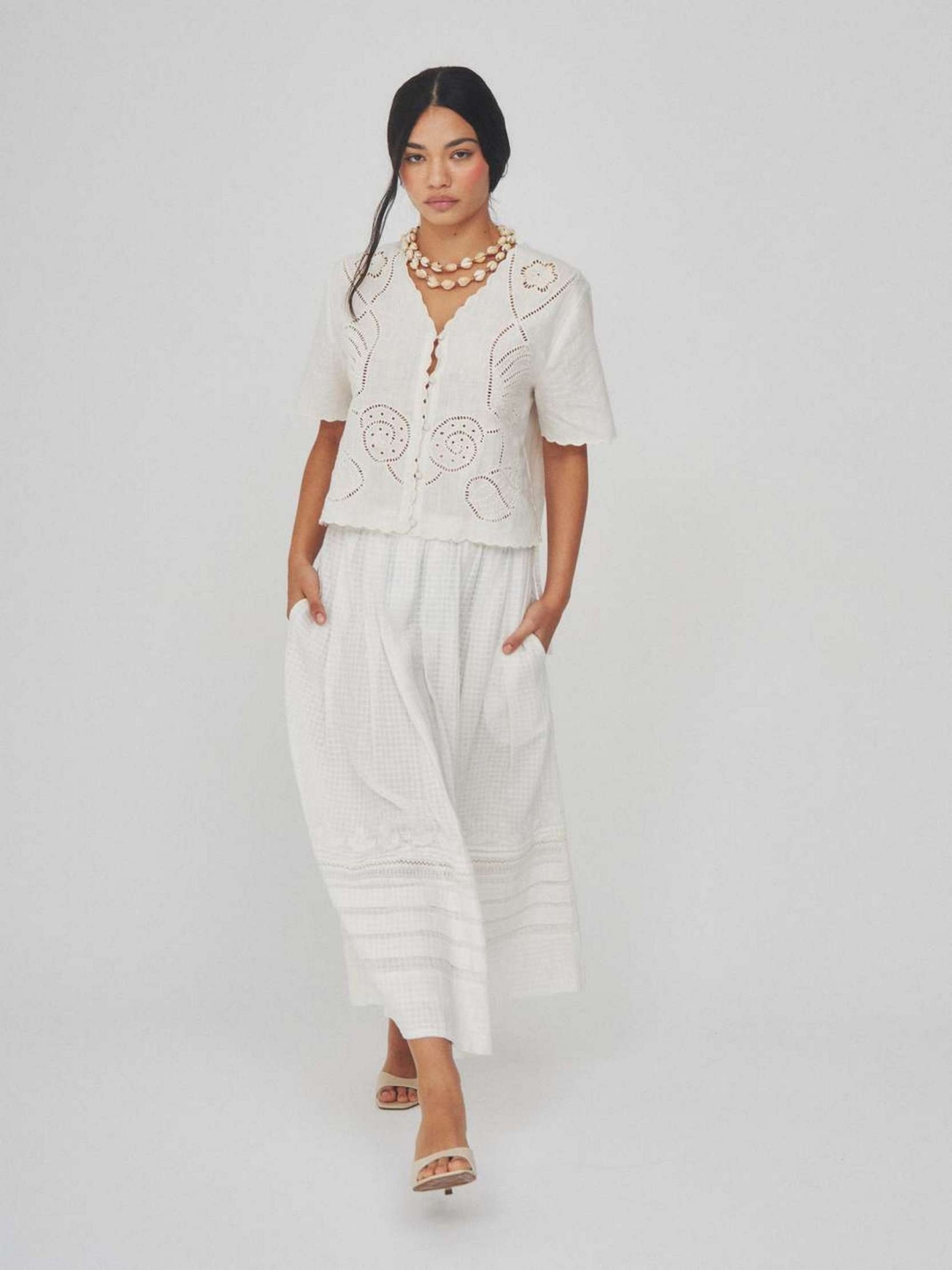 MARWA est une jupe longue évasée de couleur blanche avec une taille ajustée et des détails de dentelle délicate sur le bas. Sa coupe fluide agrémentée de jeux de plis et sa matière naturelle en font une pièce confortable et intemporelle.