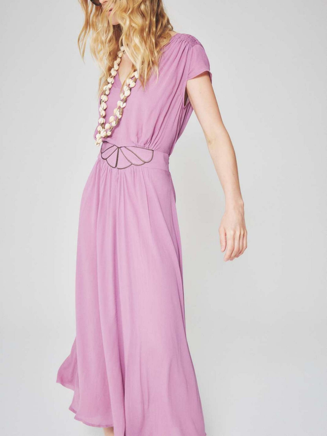 KANDY est une robe longue à manches courtes avec un décolleté en V et une taille ajustée par des bordures contrastées.