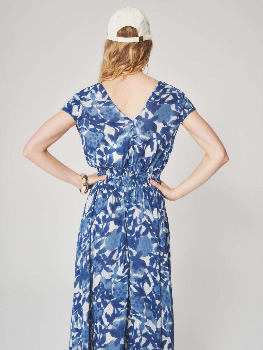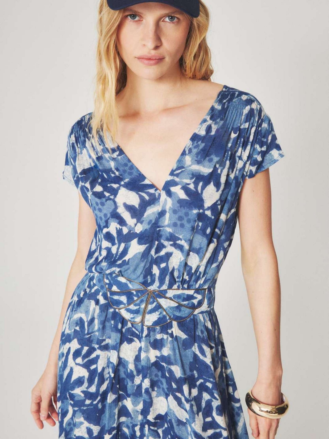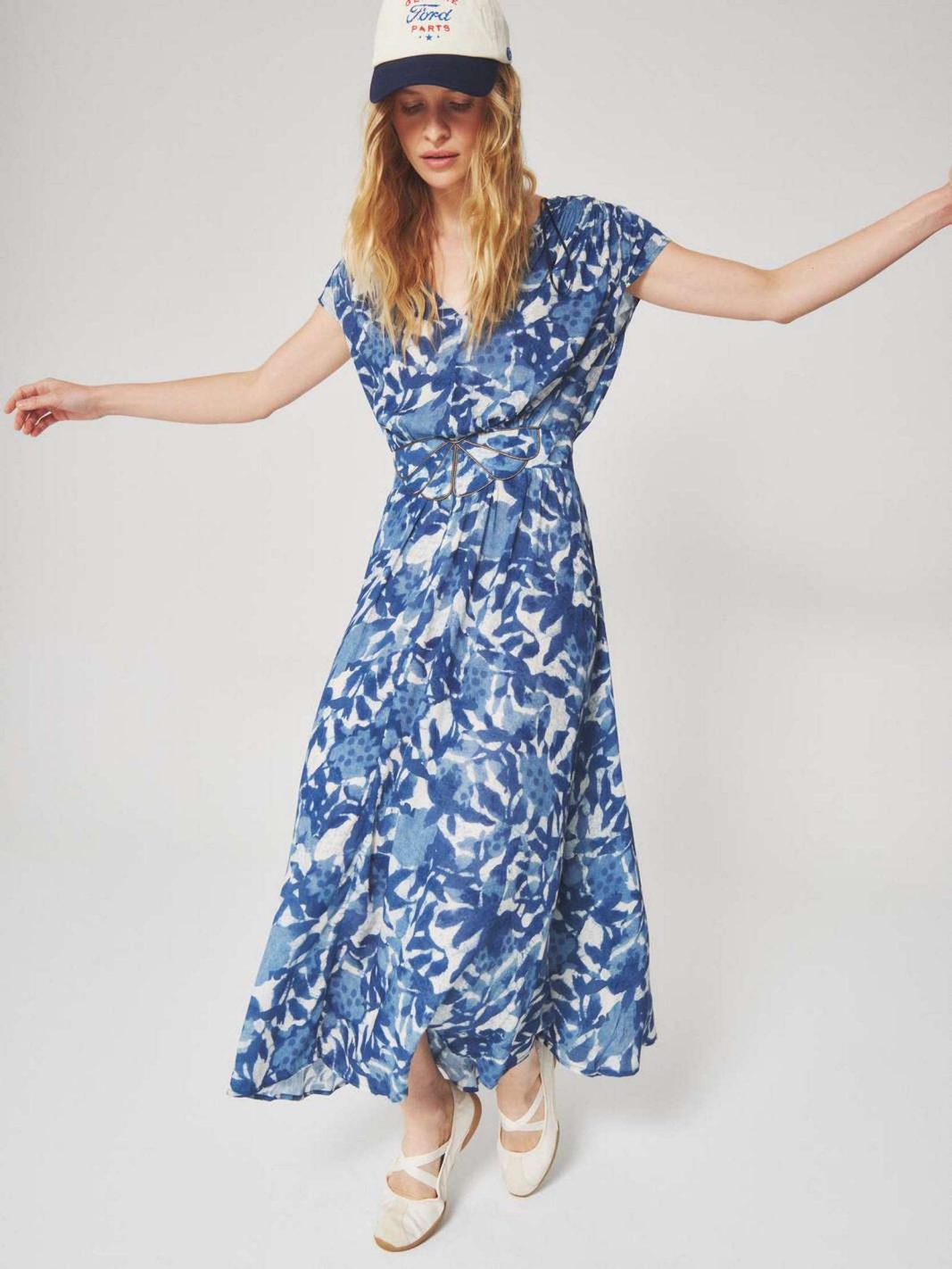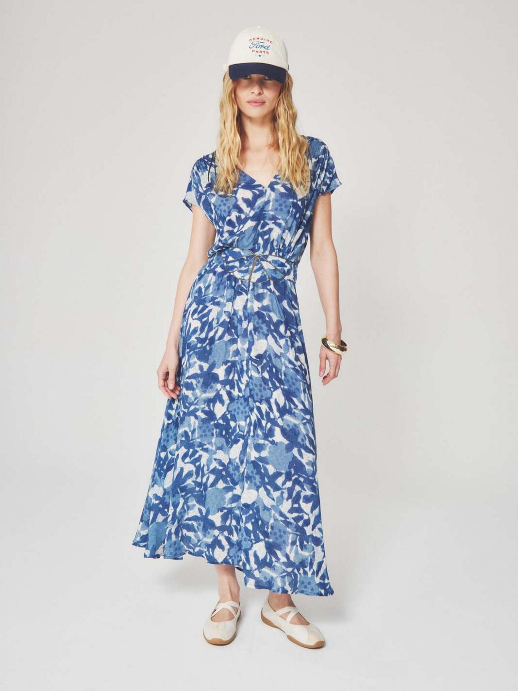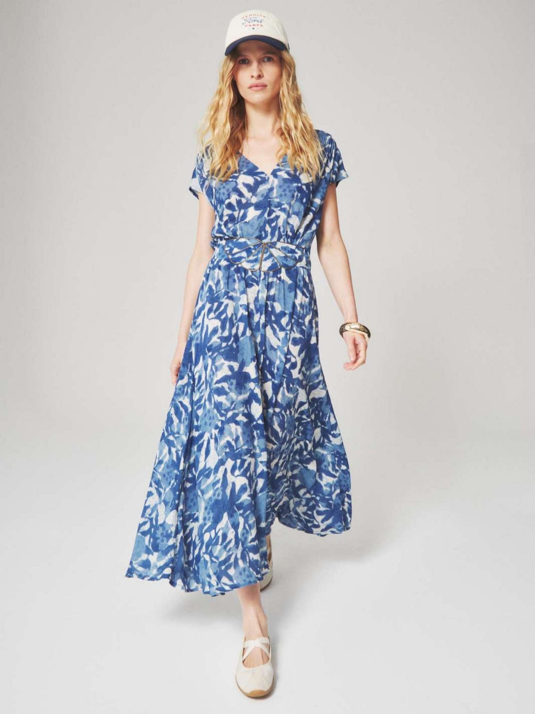KLEYA est une robe longue à manches courtes avec un décolleté en V et une taille ajustée mise en valeur par une ceinture.