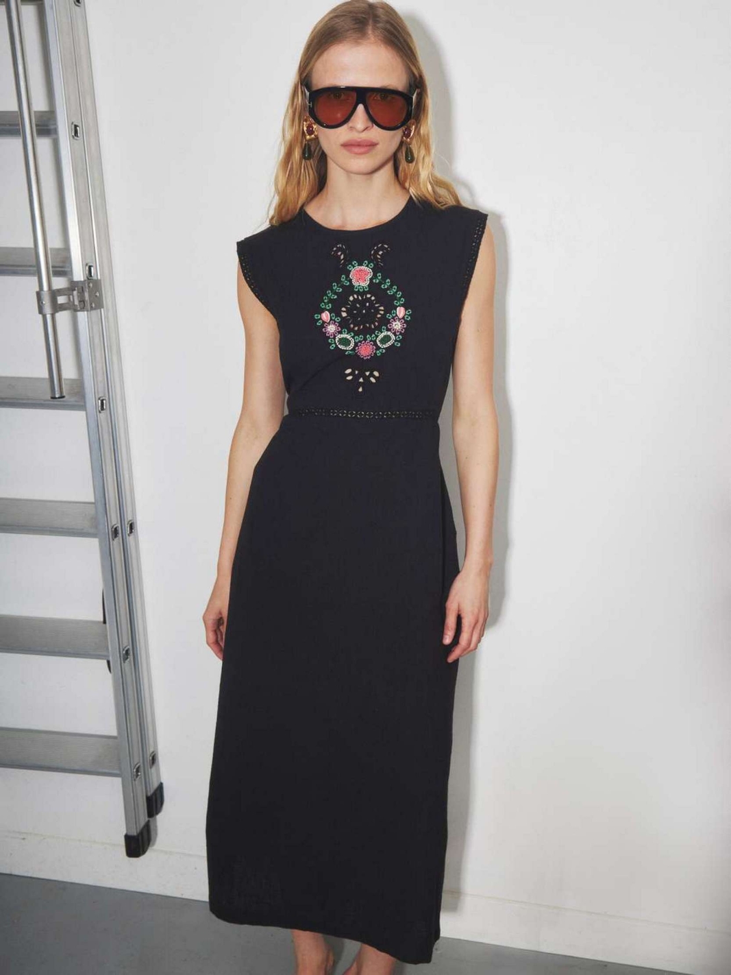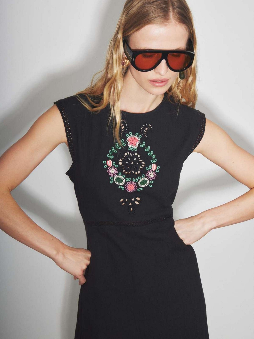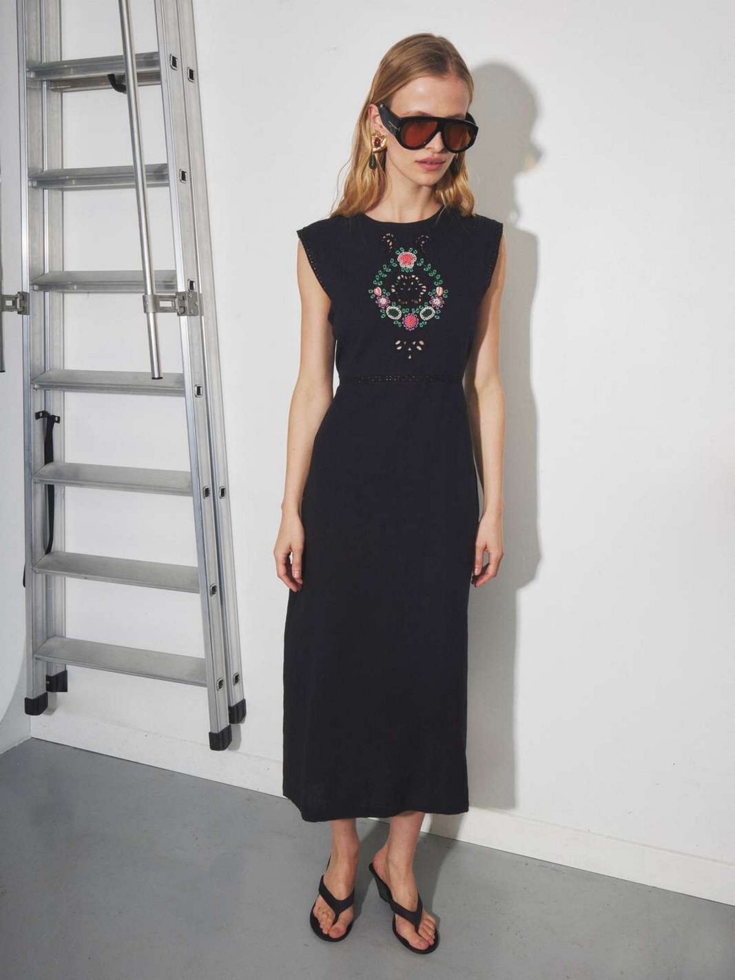 ROZA se distingue par son allure sophistiquée, mêlant une coupe longue sans manches à un travail de broderies florales multicolores sur le buste. Sa taille est délicatement soulignée par une bande ajourée, tandis que son col rond et sa ligne épurée structurent la silhouette avec élégance. Confectionnée dans une matière légère, elle s'affirme comme une pièce maîtresse de votre vestiaire pour une allure chic en toute circonstance.