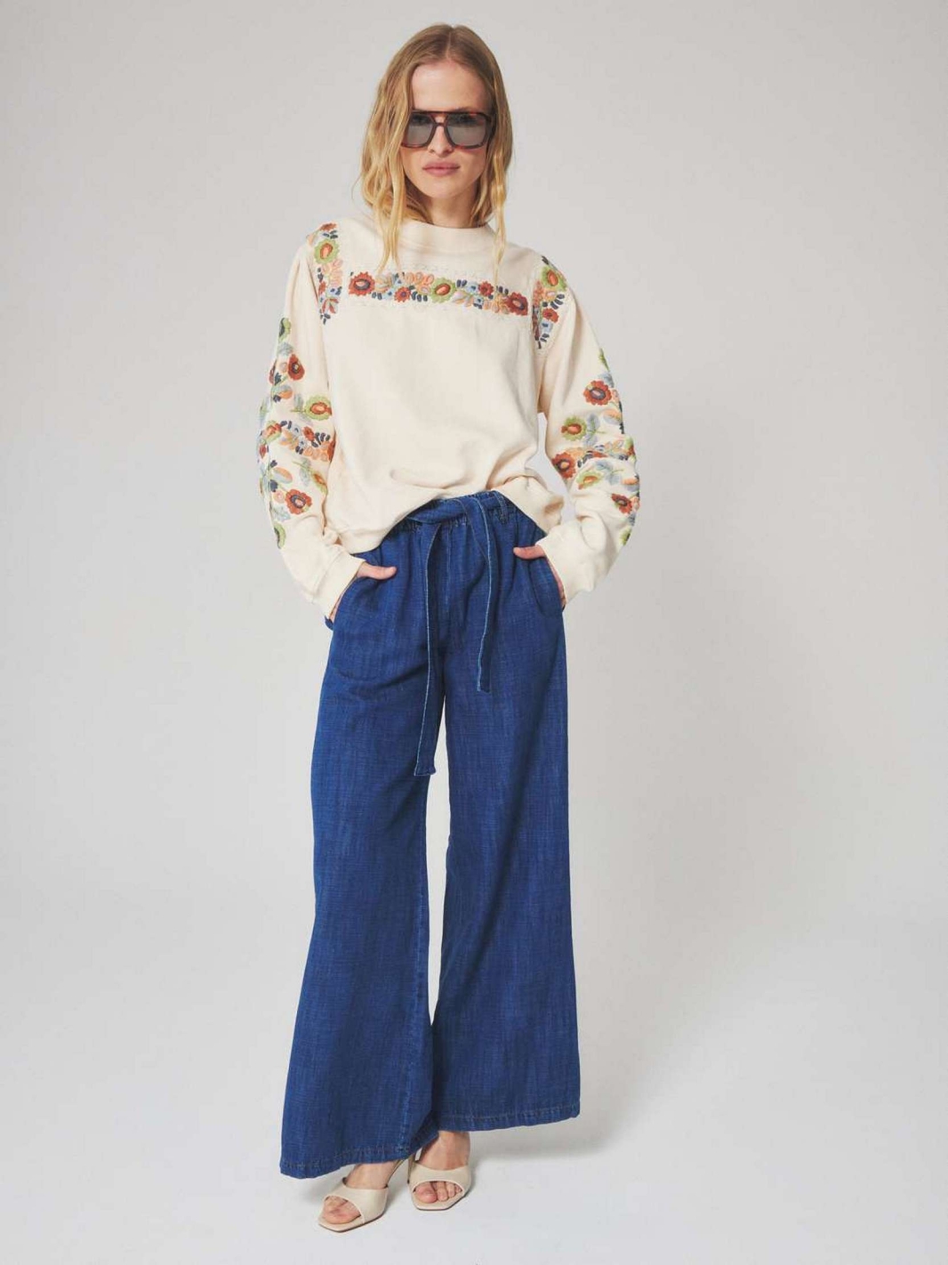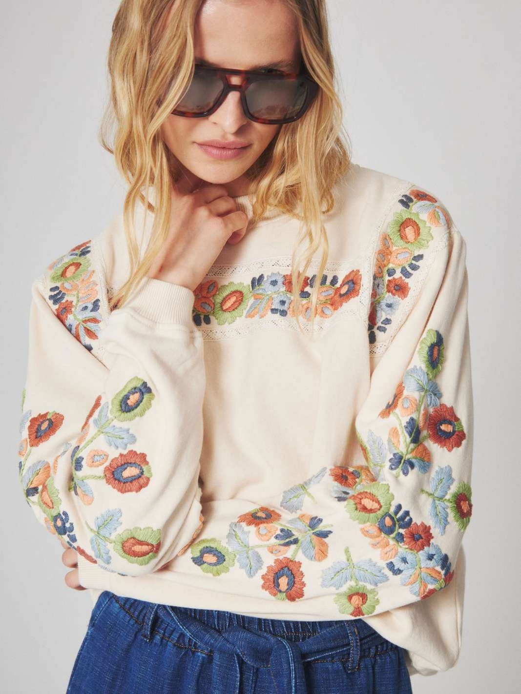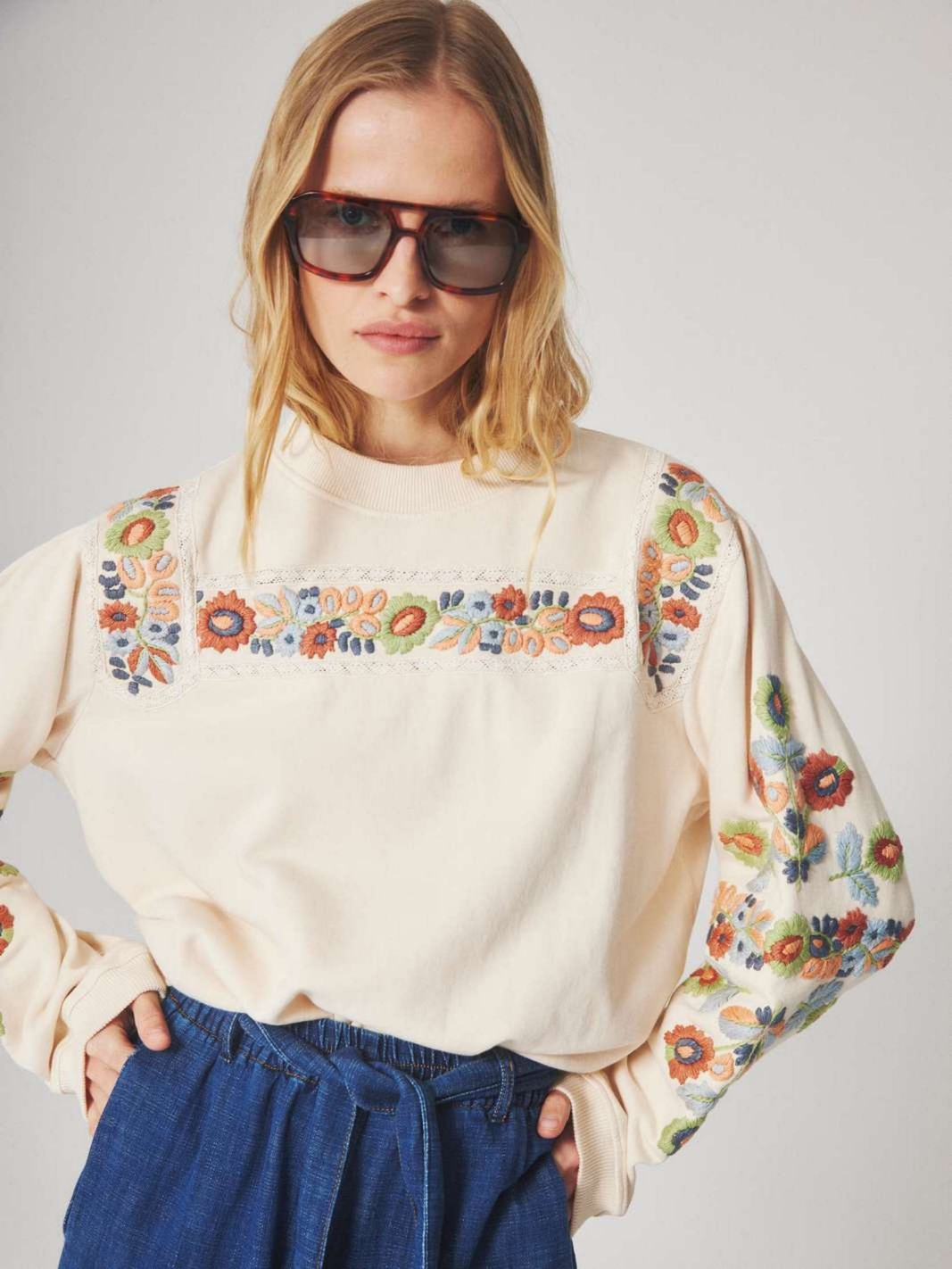 Sa coupe droite offre un tombé souple, mis en valeur par des broderies florales colorées sur le devant et le long des manches. C'est une pièce confortable et résistante, idéale pour la mi-saison.